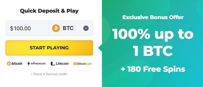 - Initial bonus up to 1 BTC + 180 free spins, with a full package reaching up to 5 BTC across four deposits
