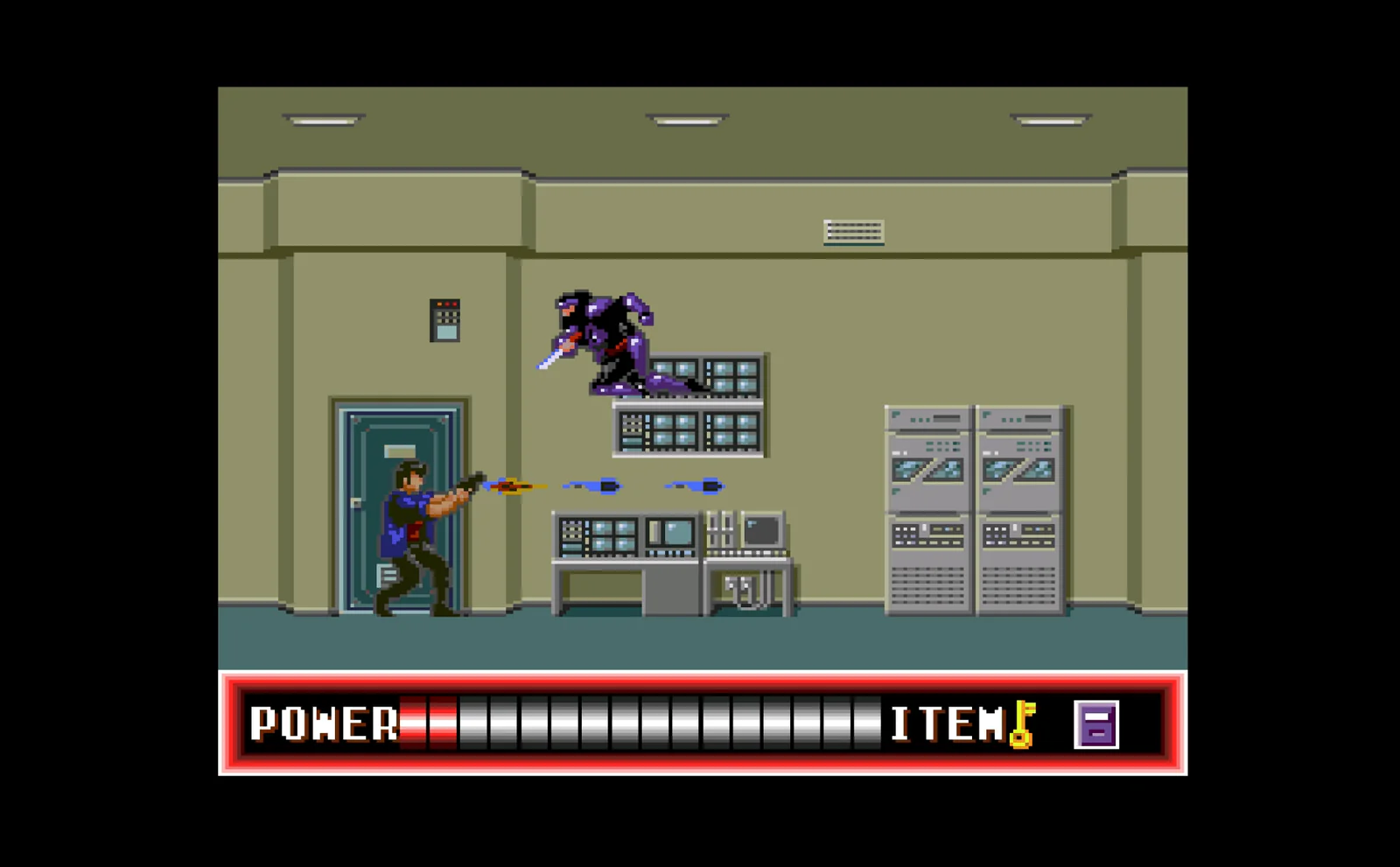 De game zelf is natuurlijk waar het om gaat. City Hunter is een 2D platformer waarbij je voornamelijk horizontale en verticale ruimtes moet doorzoeken. In deze ruimtes, die zich voornamelijk achter gesloten deuren bevinden, moet je sleutels, mensen en info zien te vergaren om zo tot bij de boss te geraken van elke level. Hierbij ben je in het bezit van een aantal vuurwapens die je tijdens je avontuur kan bemachtigen. Vijanden komen je vaak gewoon tegemoet en het hangt van je snelheid af om ze op tijd te stoppen. Natuurlijk hebben we hier een game die gemaakt is in de jaren 80/90 dus op vlak van gameplay zal het je niet zwaar versteld doen staan. De controls werken behoorlijk goed op de Switch. Je hebt links, rechts, bukken, springen en schieten. En met de up-toets kan je deuren openen die zich in het level bevinden. Enkel als je trappen op- of afgaat kan je je weleens vergissen, omdat je tegelijk vooruit en onder/boven moet drukken.