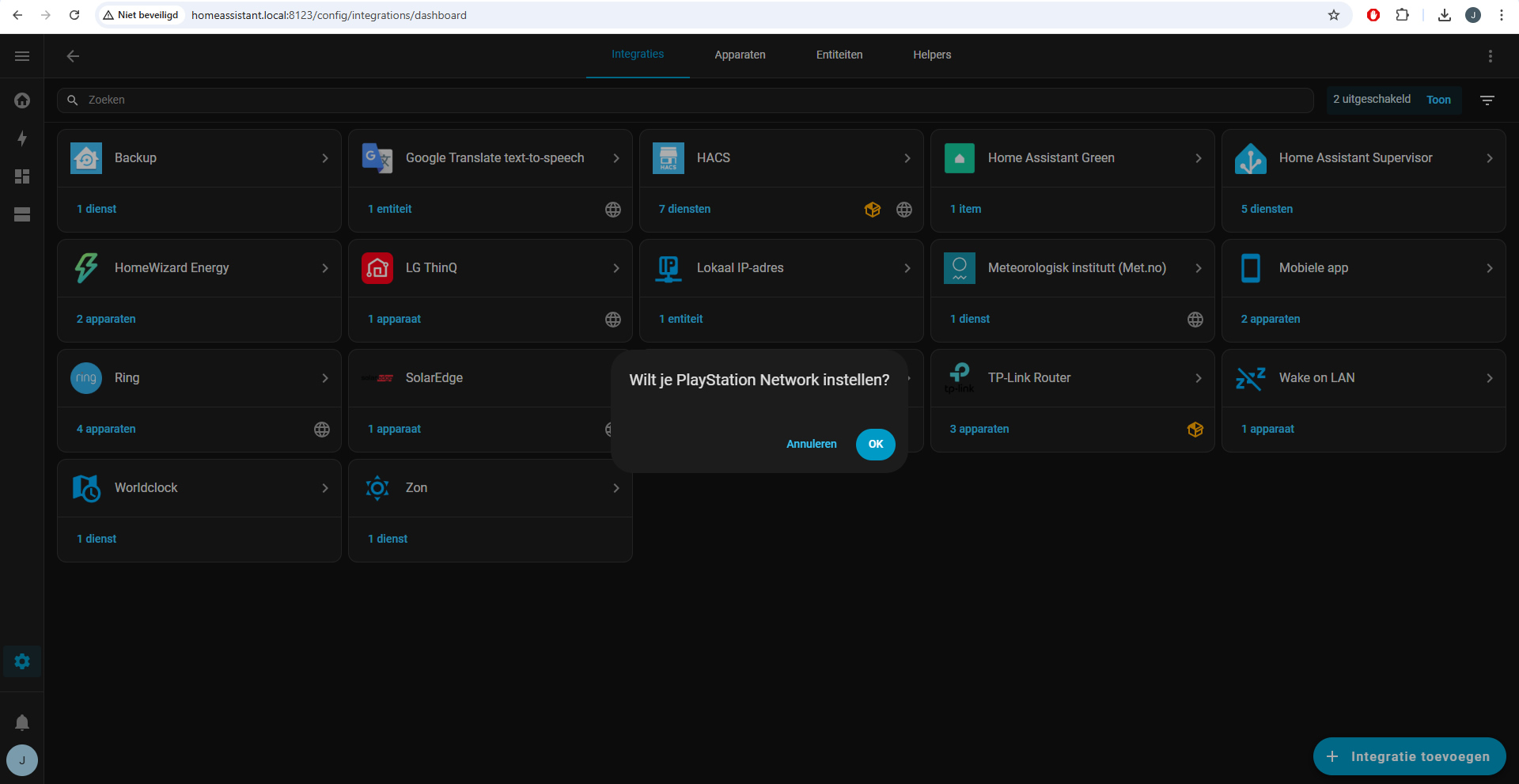 Voor Home Assistant gebruik je altijd integraties om bepaalde apparaten of internet services te koppelen. Voor Sony’s PlayStation zijn er verschillenden, maar de handigste is wat mij betreft toch wel de PlayStation Network-integratie. Door op ‘Add integration to MY’ te klikken kun je deze snel toevoegen in Home Assistant. Het volgende scherm komt nu naar voren: