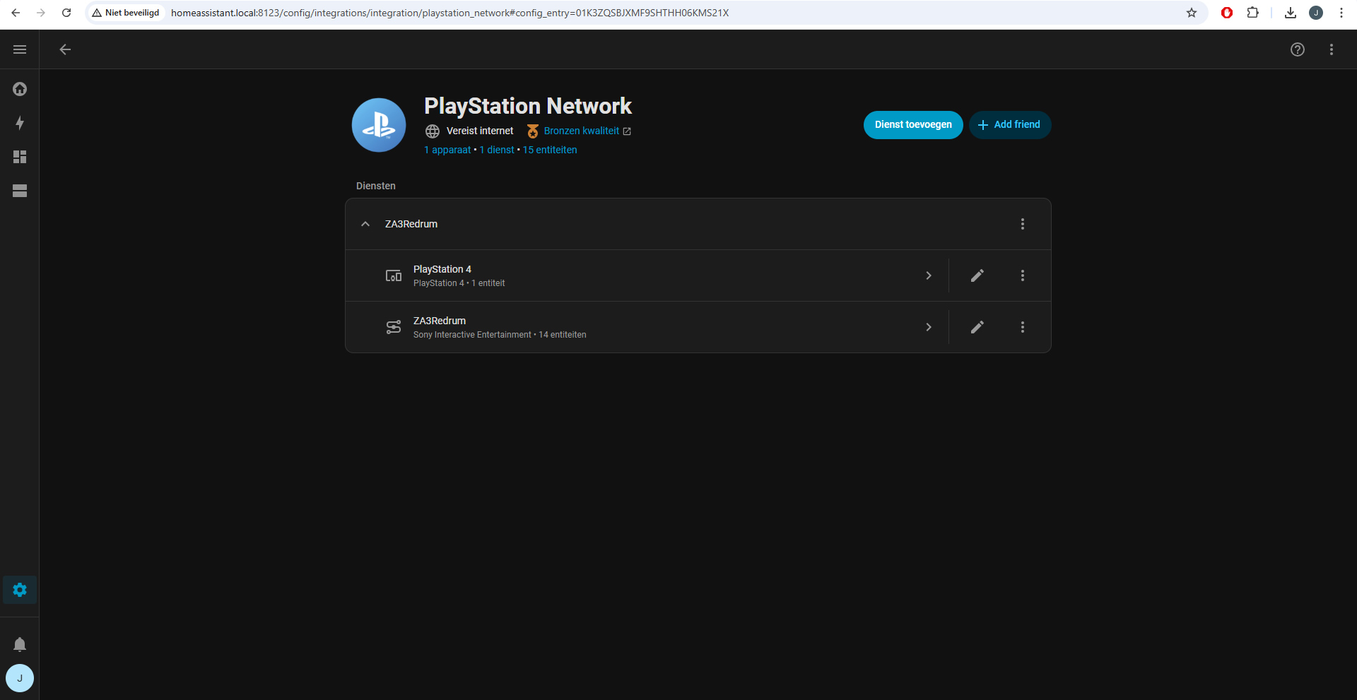 In dit geval gebruik ik een oude, niet gebruikte account waarin alleen nog maar een PlayStation 4-koppeling aanwezig is, maar een PS5 is ook gewoon te zien uiteraard! Deze single sign on-key kun je vervolgens direct instellen via Home Assistant door de wizard door te lopen. Het betreft in principe een REST API-authenticatie die hierbij plaatsvindt. REST API wordt veelal gebruikt als zijnde de communicatie API met andere interfaces. Wanneer je de key ingesteld hebt – en meer hoef je ook niet te doen – dan kun je de entiteiten zien in een overzicht waarin je vanzelf terecht komt: