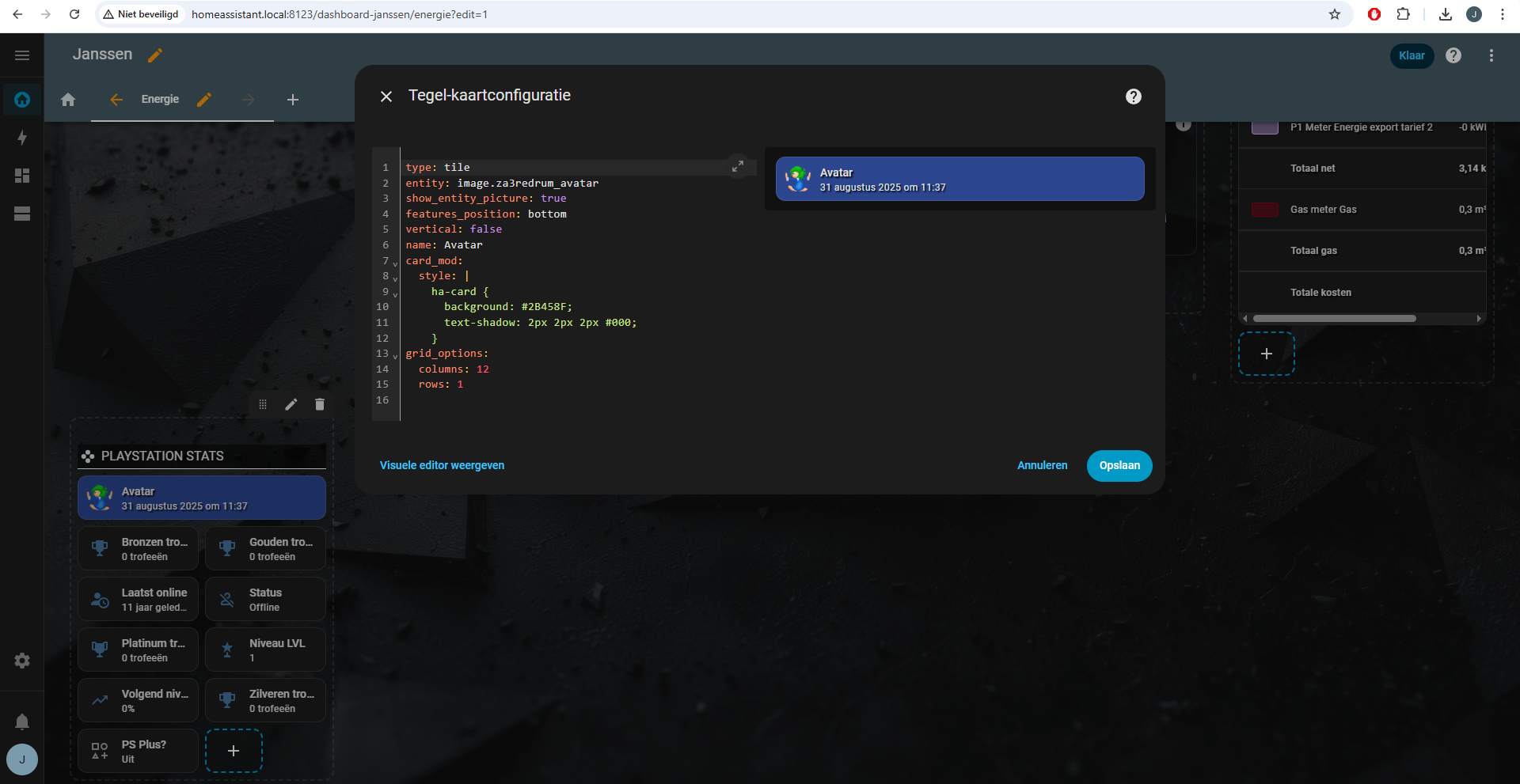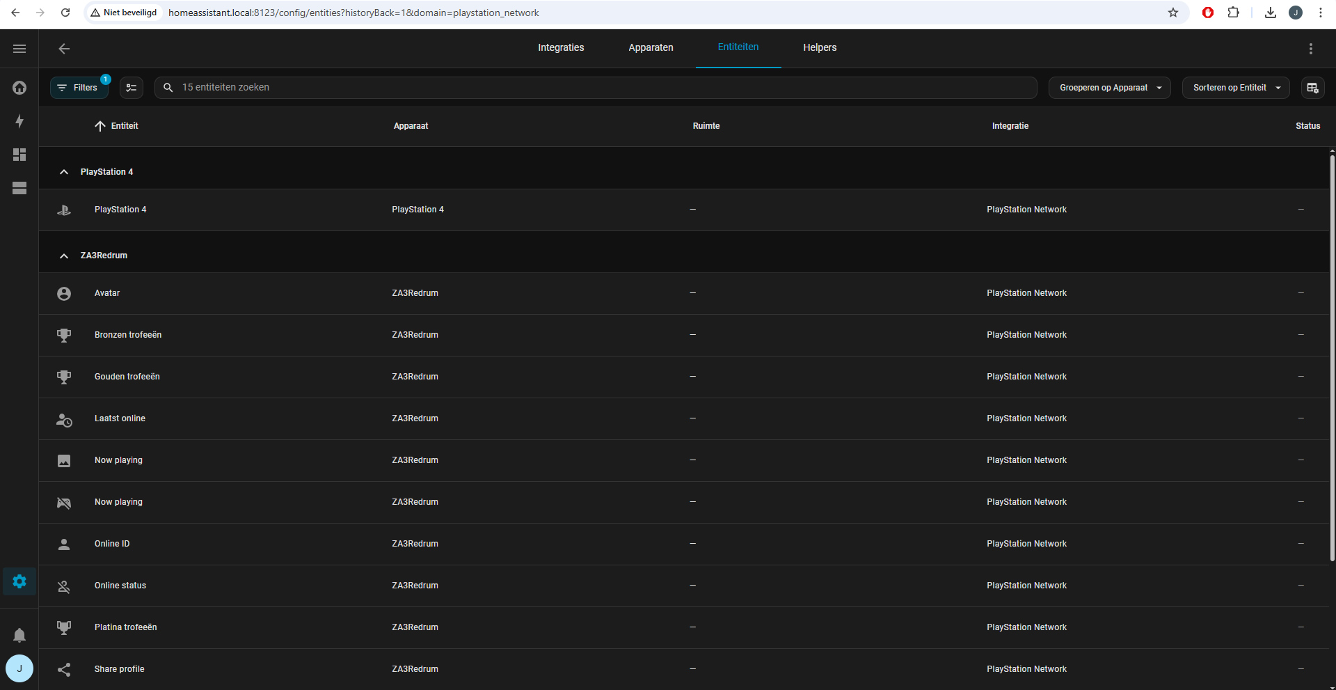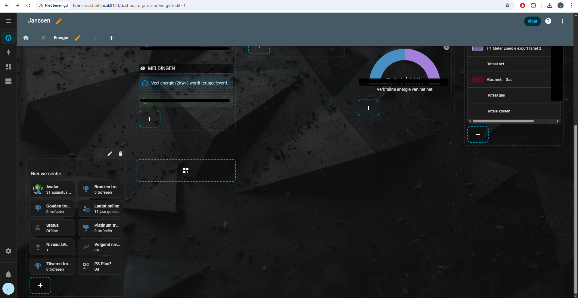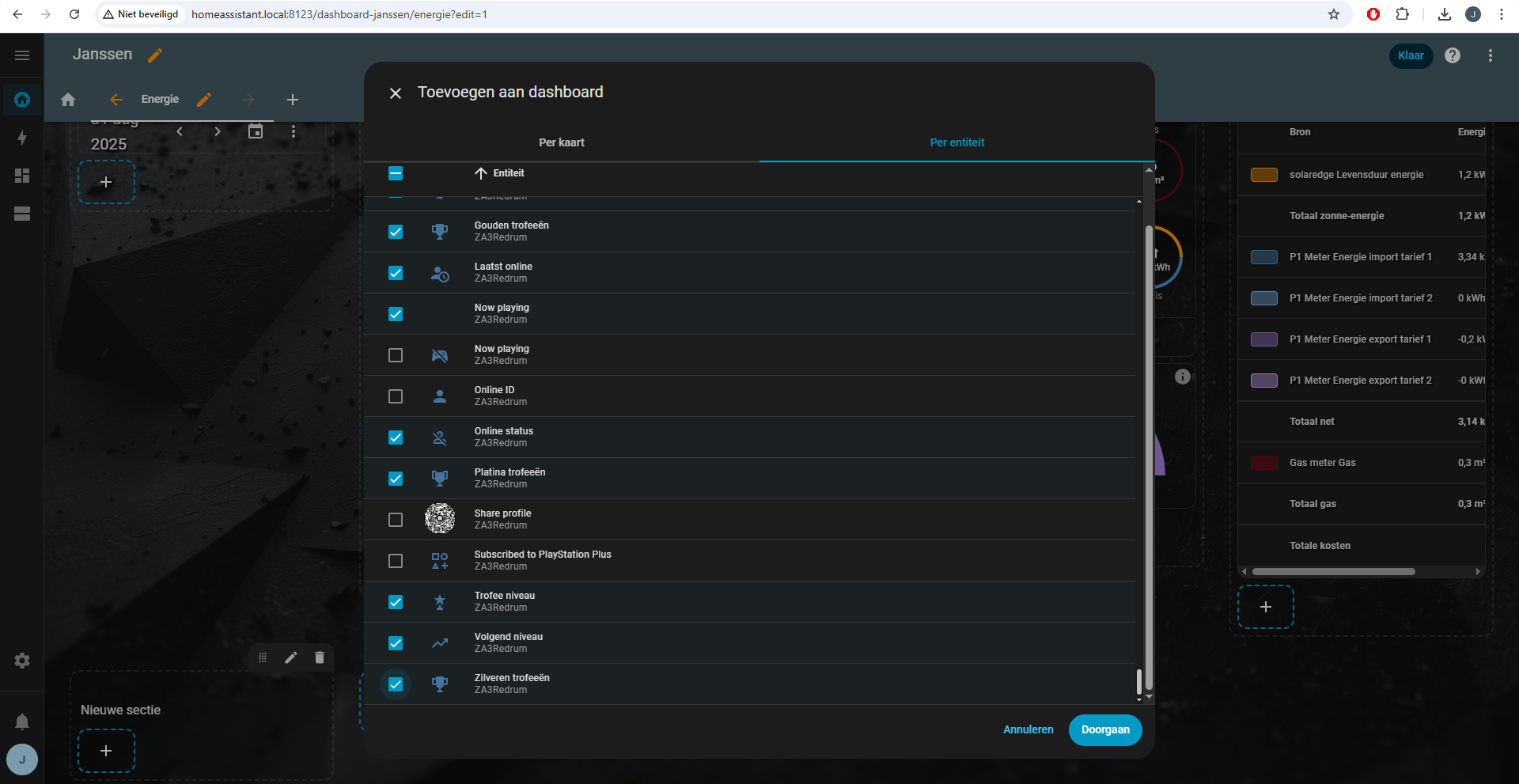 Wanneer je vervolgens in je dashboard-pagina terecht komt (je moet wel een beetje de weg weten in Home Assistant natuurlijk), dan kun je daar een nieuwe sectie toevoegen. Hierbij kun je selecteren welke entiteiten je wilt toevoegen. Dit kunnen bijvoorbeeld je trophies zijn. Je kunt toevoegen wat je wilt, maar je kunt ook weg laten wat je wilt. Dus als je alleen je avatar wilt tonen, dan voeg je alleen die integratie toe aan je dashboard. Het gaat hier vooral om stats die je kunt tonen en niet om buttons of acties. Daar zijn weer andere integraties voor aanwezig die bijvoorbeeld je console zelf kunnen aansturen, uitlezen en activeren met switches, maar daar gaan we voor nu even niet naar uitweiden. De statistieken kunnen maximaal 300 keer per 15 minuten pollen, maar dat zo op zich genoeg moeten zijn om redelijk real-time data te verzamelen. Maar houd er dus rekening mee dat Sony een cap heeft op het API-gebruik.