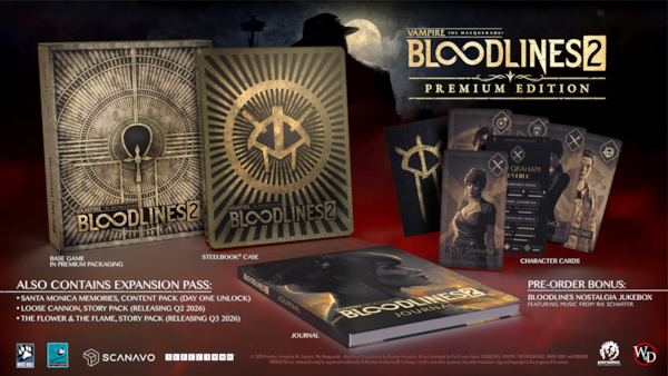 - Vampire: The Masquerade – Bloodlines 2: Premium Edition (€89.99) bevat de basisgame, Bloodlines Nostalgia Jukebox pre-order bonus, de Expansion Pass, vijf character cards, een dagboek en een Steelbook case verpakt in een hoogwaardige doos.