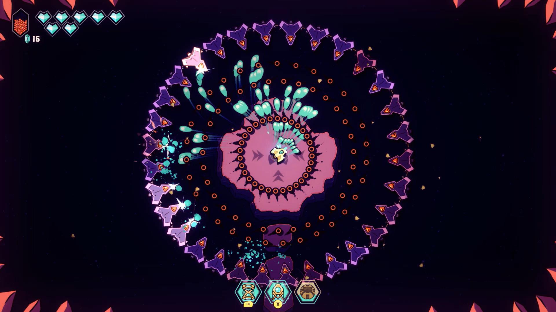 Naast nieuwe abilities speelt ook het upgradesysteem een belangrijke rol. Door vijanden te verslaan verzamel je kristalscherven. Zodra je er genoeg hebt verzameld kun je deze investeren in een skilltree. De upgrades zelf zijn vrij eenvoudig. Meer kogels tegelijk afvuren, sneller schieten of extra schade aanrichten. Het systeem biedt weinig verrassingen, maar werkt wel precies zoals je zou hopen. Wat daarbij vooral opvalt is dat de upgrades daadwerkelijk impact hebben. Sommige vijanden worden namelijk aanzienlijk lastiger wanneer je schip nog onvoldoende ontwikkeld is. Door te investeren in je vuurkracht of snelheid merk je direct dat gevechten makkelijker worden.