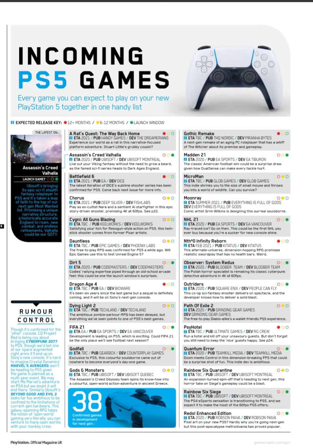 De juni-editie van het Offical PlayStation Magazine zal maarliefst 38 games bevestigen voor de PlayStation 5. Dat wordt gemeld via de website van PSU. Enkele daarvan zijn uiteraard al bekend, en zijn multiplatform games, waaronder Assassin’s Creed Valhalla. Veel games zouden echter nog niet bekend zijn op dit moment. Daarnaast wordt gegarandeerd dat de PS5 zeker in juni verder onthuld zal gaan worden. De console staat gepland voor een lancering eind dit jaar.
