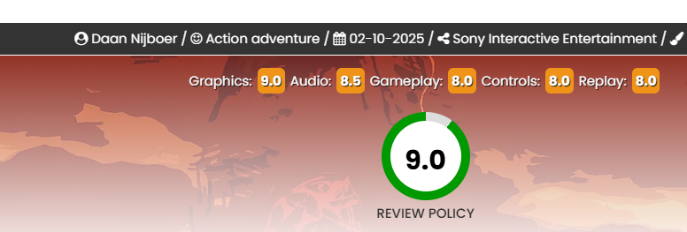 Elke game wordt beoordeeld op meerdere aspecten, waaronder gameplay, verhaal, presentatie, geluid, performance en originaliteit. De eindscore weerspiegelt de algemene ervaring van de reviewer, maar de tekst zelf biedt de context die nodig is om die score goed te begrijpen. De cijfers voor graphics, audio, gameplay, controls en replay maken samen geen uiteindelijk gemiddelde van het cijfer. Het uiteindelijke cijfer kan dan ook op basis zijn van belangrijke elementen die zwaarder of minder zwaar wegen in het eindoordeel. We tellen dus niet de vijf cijfers bij elkaar op en delen deze simpelweg door vijf. Een eindoordeel kan dan ook afwijken van deze vijf subcijfers. Beneden vind je een voorbeeld van een dergelijke beoordeling waar geen gemiddelde/calculatie wordt toegepast: